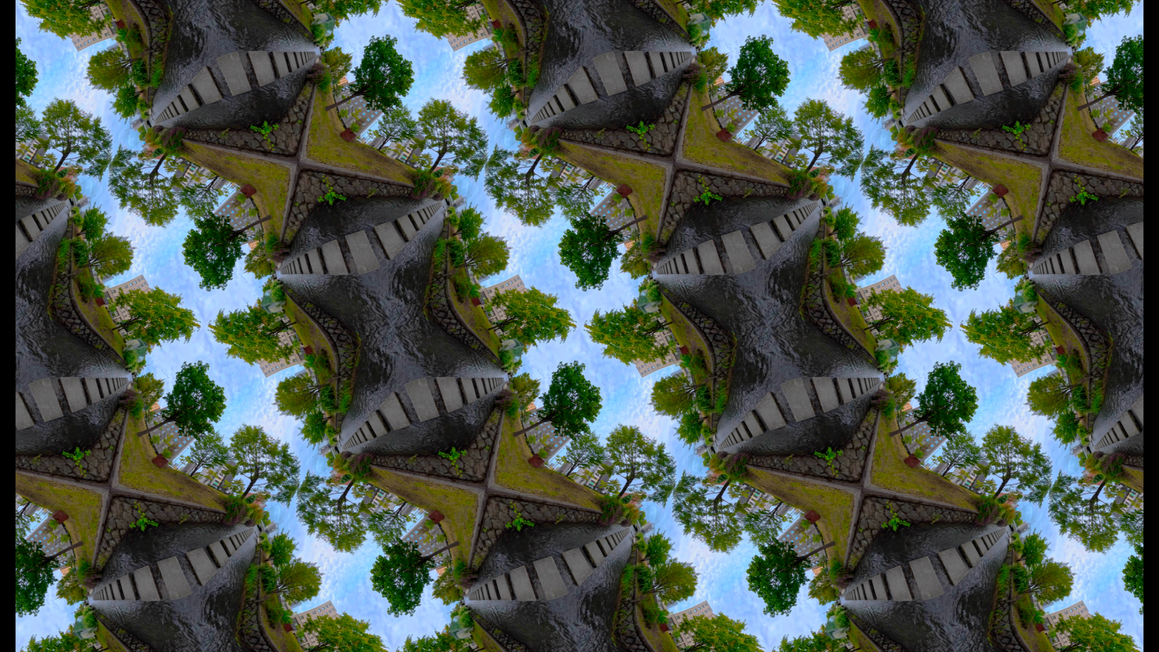 コンセプト:この作品は、札幌の多様な風景が織りなすつながりを描きました。北海道に古くから住み続けてきたアイヌの人々は、森、水、土などの自然や人間の力が及ばないものに魂が宿ると考え、札幌を一望できる藻岩山(インカルシペ)の頂から自然の変化を見守ってきました。本作では、川や森、都市がつながり合い、現在の札幌を一望するような映像表現を試みています。全方位映像にオーサグラフ図法を応用することで、従来の視野をフレームで切り取る映像表現とは異なり、視野全体をフレームに収めました。これにより、見慣れた風景の中にありながらも人間の視覚を拡張したような視覚表現が実現します。さらに、映像同士がタイルのようにつながり、都市と自然といった異なる環境の空間がシームレスに結びつく、新たな映像体験を生み出します。The Village Sapporoを訪れる人々は、札幌の風景が織りなす感覚を味わい、都市と自然、そして過去から未来へと続くつながりを体感します。